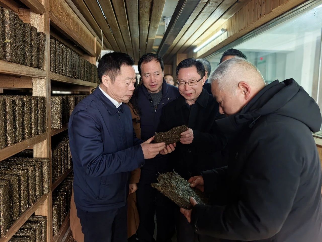 調(diào)研組深入公司一線,實(shí)地考察了保障戰(zhàn)略儲備的邊銷茶原料庫、展現(xiàn)智能升級的篩分與壓制車間、關(guān)乎品質(zhì)核心的“金花酵庫”,以及承載歷史文脈的湘益茶博館。何寄華副主席細(xì)致詢問了原料管控、工藝流程、技術(shù)裝備及非遺技藝活態(tài)傳承等情況,對“湘益”品牌近七十載如一日保障邊疆供應(yīng)、促進(jìn)民族團(tuán)結(jié)所作出的歷史性貢獻(xiàn)給予高度評價(jià)。